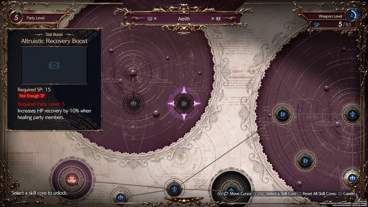One of the best Stat Boosts you can give Aerith is Altruistic Recovery Boost. Costing 15 SP, this will increase HP recovery by 10% when Aerith is healing her party members.