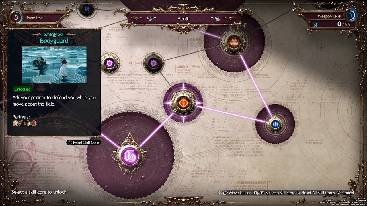 The problem I find with Aerith is raising her ATB gauge fast, which doesn’t work as well as most party members. To make sure she can heal up her party without being hit by enemies, unlock the Bodyguard Synergy Skill.