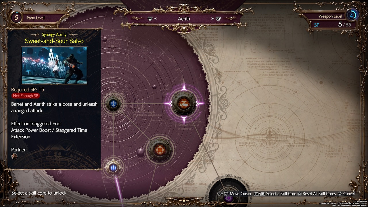 Another good Synergy Skill for Aerith in FF7 Rebirth is Spellbound Blast, which works with Tifa or Yuffie. Hold down the button to gather strength alongside your partner to release a charged attack. Charged attacks in the Folio skill tree seem to do an impressive amount of damage.