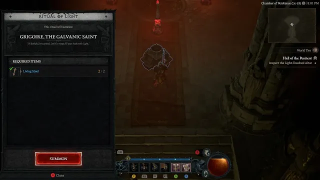You’ll need to acquire Living Steel first. We have a guide detailing how to find this resource, but the short of it is that you can find Living Steel during Helltide Events from Tortured Gift of Living Steel chests. Depending on the World Tier you’re fighting Grigoire on, you’ll need different amounts of Living Steel: