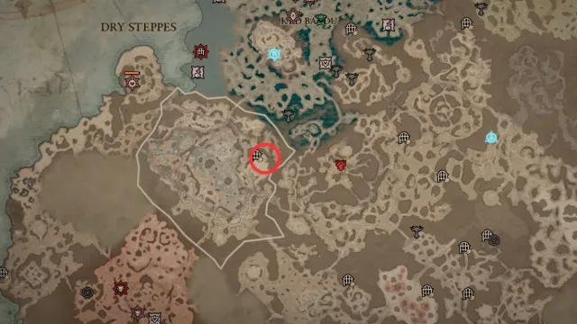 In the Dry Steppes you’ll find an area called Dindai Flats. Right on the eastern edge of the Dindai Flats and beside Khargai Crags is where the entrance to the Hall of the Penitent is. Unfortunately, you can’t just stroll into the Dungeon and expect to face off against Grigoire.