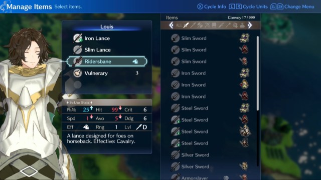 On the Inventory screen where you manage items, check individual stats for information about special efficiencies. For instance, Louis (pictured above) can equip the Ridersbane to gain efficiency against Cavalry units. Additionally, that weapon will fare well in general against enemies wielding swords.