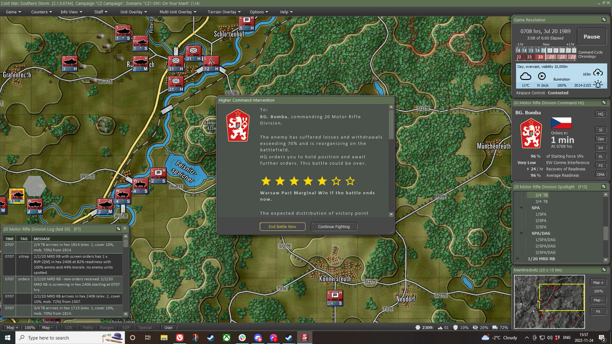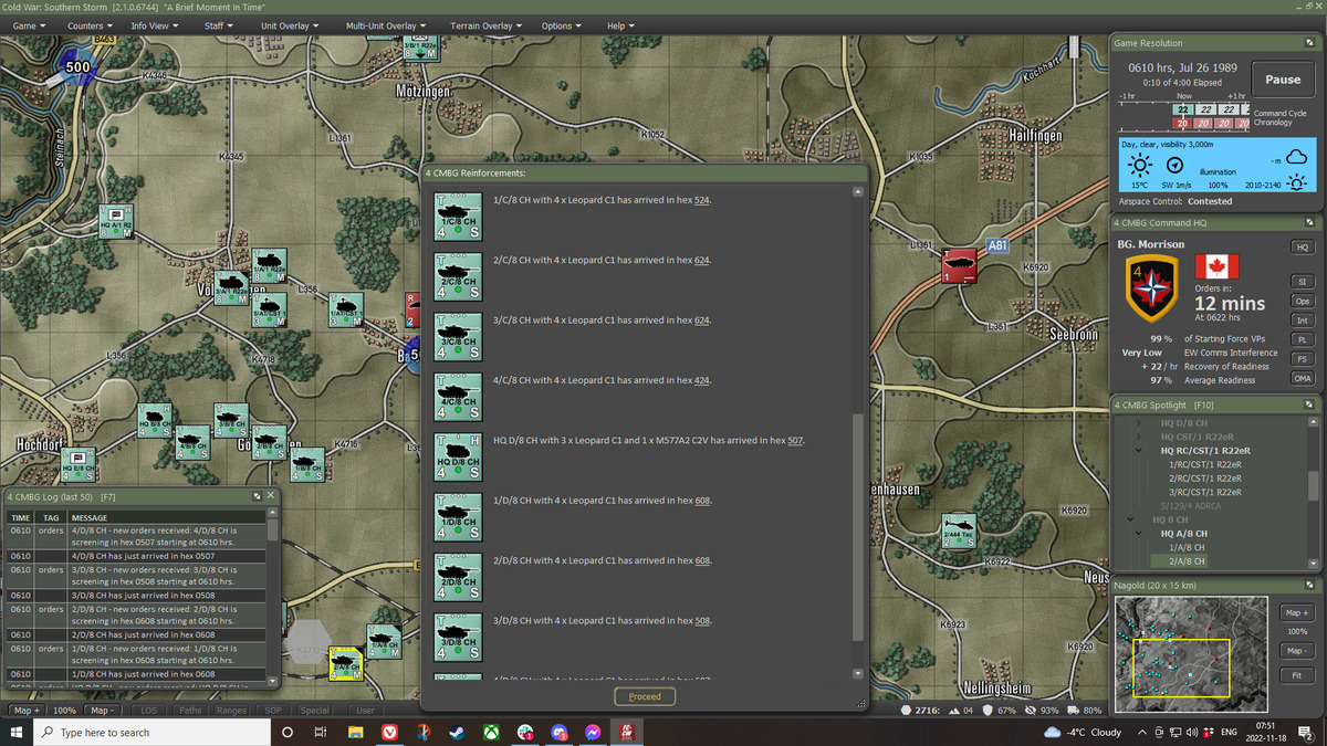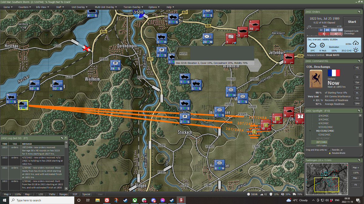 On the battlefield, Flashpoint Campaigns: Southern Storm will put you on maps 20 km by 15 km in size, split into 500-meter hexagons. Terrain matters a lot, with each hex having its own traversability, height, feature height, cover, and concealment stats. On the more lively side, your units are simulated down to vehicle or individual squad, with stats covering sensors, systems, weapons (down to grenades), and so on.