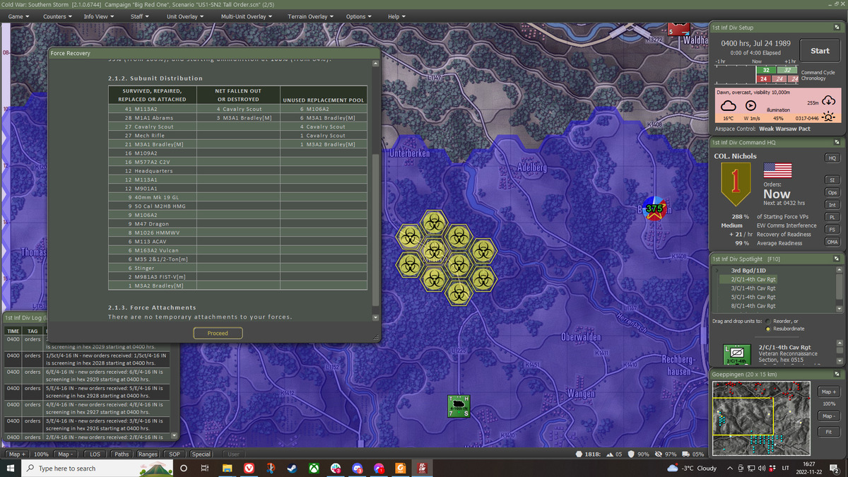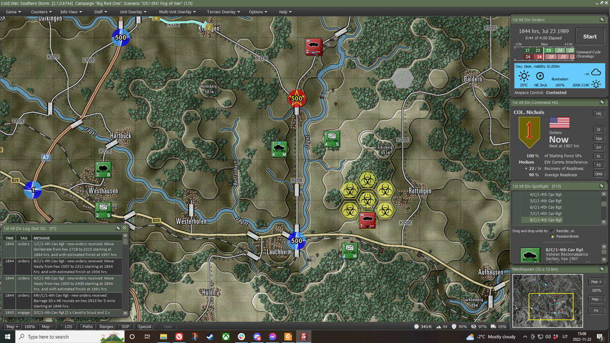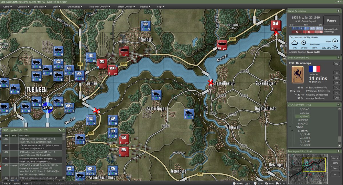 If you try to learn everything about your forces, you will rapidly go insane — leave that task to the game engine. Instead, you should focus on useful abstractions: ATGMs will ruin your day at awful ranges, artillery is good to drop on anything, even hexes that merely look suspicious, infantry doesn’t want to get caught in the open, and so on. Leave to the Flashpoint Campaigns: Southern Storm engine to worry about the minute differences between the Stadia coincidence rangefinder and a laser rangefinder. Such details are beneath a commander of your rank.