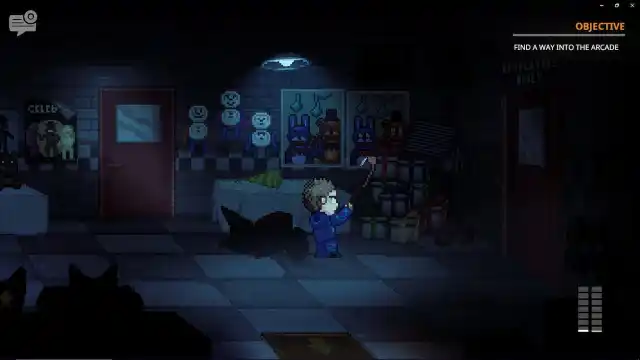 Interact with the vent and select the sticky hand, allowing Oswald to open the vent and reveal the keys to the arcade. Enter the arcade and walk left until you trigger a cutscene showing Bonnie, who scares you out of the room. In order to help the kid, you need to get Bonnie out of there.
