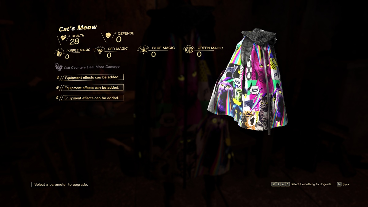 The cloak has various cats as its design, as well as a lot of “meows” etched on the hood. By default, it gives +28 health, and it has a perk that makes Cuff Counters deal more damage (i.e., the game’s counterattack combat mechanic). Moreover, it’s got additional slots for more perks. Later, once you’ve unlocked the Diversify passive, you can also add a fourth slot.