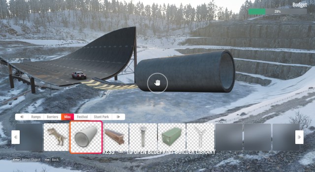 Building a course for myself made me appreciate something. It is a challenge within of itself to create something that’s both interesting and functional, given the fact that you have to do it within the confines of Horizon 4‘s map. Thankfully, physics and collision detection matter not when building. Objects can be morphed into one another and deliberately clipped into the environment all for the sake of making your design work to your needs. You can also take advantage of nature itself by selecting the time of day and season that the challenge takes place in, further widening the span of design possibilities.
