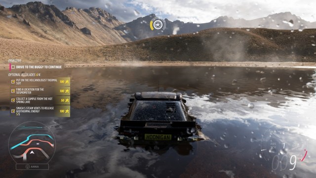 There’s a pool of water to your right after the cutscene. All you need to do is drive your car to the middle of the water to complete this task. You’ll also receive a clue for the Ford Racing Escort Barn Find.