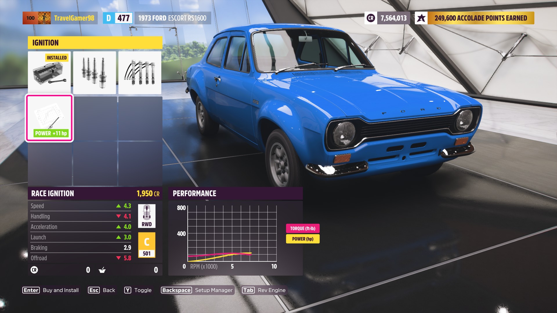 As you can see, the stock version of the Escort is a D class, the lowest performance class in the game. But, this first tune bumps it all the way up to a very capable S1 monster. All of its stats are boosted across the board, gearing it towards rally races. While it would’ve struggled to get to 60mph in almost ten seconds, it can now get there in under three. Not to mention its now capable of going nearly 100mph faster than before.