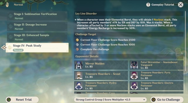 - Ley Line Disorder: Nucleus – This effect is active throughout all challenges/stages. Elemental bursts give one Nucleus stack that provides the entire party with +5% ATK and +10% DEF (maximum of six stacks). If a character with three Nucleus stacks uses an elemental burst, all party members gain +50% energy recharge.