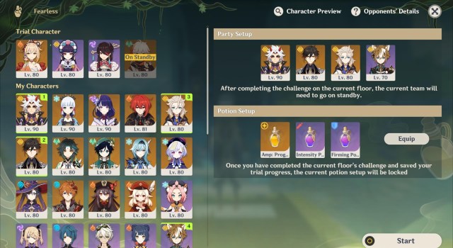 After selecting a challenge/stage, you can see the roster and potions selection. Here’s the gist: