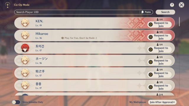 At Adventure Rank 16, you’ll unlock the game’s co-op mode. This lets you invite or join other players’ games. Here’s the gist according to Genshin Impact‘s wiki:
