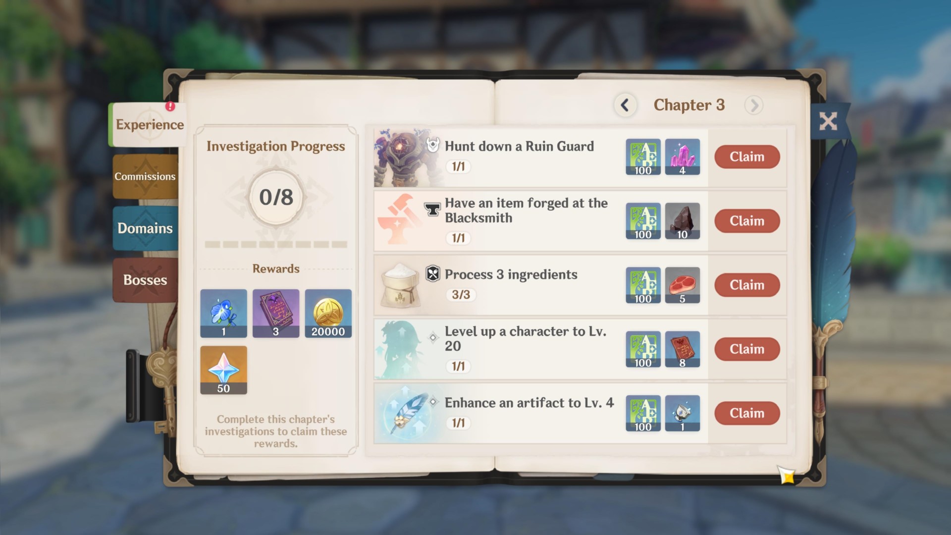 The Adventurer’s Handbook also has additional tabs so you can see Commissions, Domains (i.e., the Spiral Abyss and other open-world locations), and bosses. Completing these objectives net you rewards too.