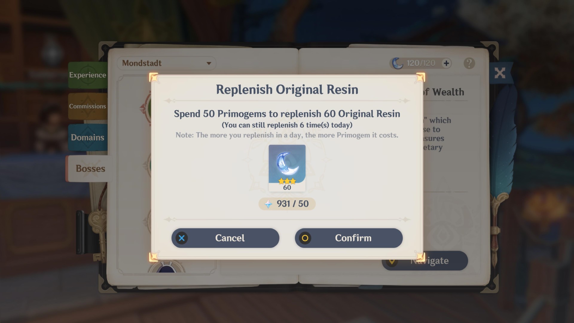 Note: Under the bosses tab, you’ll see a moon symbol. This denotes “Original Resin” – an in-game currency that lets you open the chests from these activities. Original Resin does get depleted, but it’s also restored over time. Likewise, you may use Fragile Resin or Primogems to restore the Original Resin’s value.