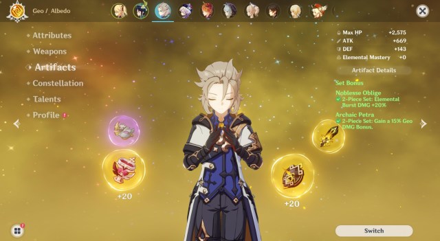 Archaic Petra buffs Albedo’s Geo damage considerably. Noblesse Oblige, meanwhile, improves the damage of his elemental burst, Rite of Progeniture: Tectonic Tide. His burst has a low cooldown and gets charged ridiculously fast, too. However, if you don’t want Noblesse Oblige, you can go with the Defender’s Will 2-piece bonus which adds a whopping 30% DEF. Thing is, Albedo’s elemental skill is amplified by his defense stat, making this spammable ability even deadlier.