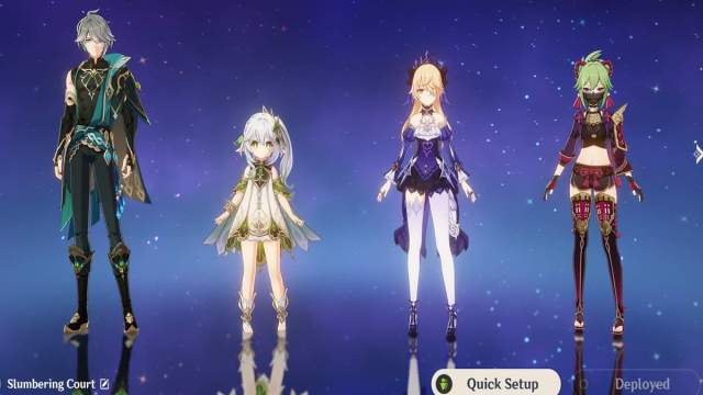 Nilou Bloom comp – Lastly, there’s a Bloom-only setup. While Bloom tends to lag behind Burgeon and Hyperbloom, it’s significantly improved if you make use of Nilou’s perks. However, this also means you’d be relegated to only Dendro and Hydro characters in your team: