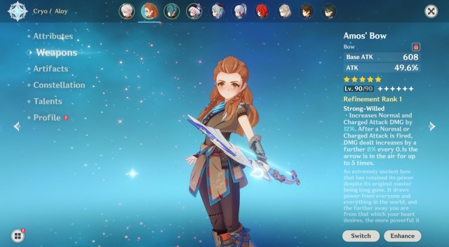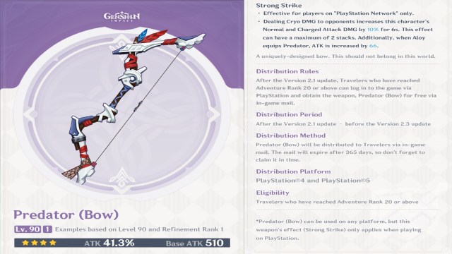 Predator Bow (ATK%) – To be clear, the Predator Bow isn’t necessarily the best weapon for Aloy in Genshin Impact. The reason I’m mentioning it here is that it’s her featured weapon (which you’ll also receive for free via in-game mail). This weapon has the “Strong Strike” perk. It gives +66 ATK when equipped, and +10% normal and charged attack damage whenever you deal Cryo damage; lasts six seconds and stacks up to two times.