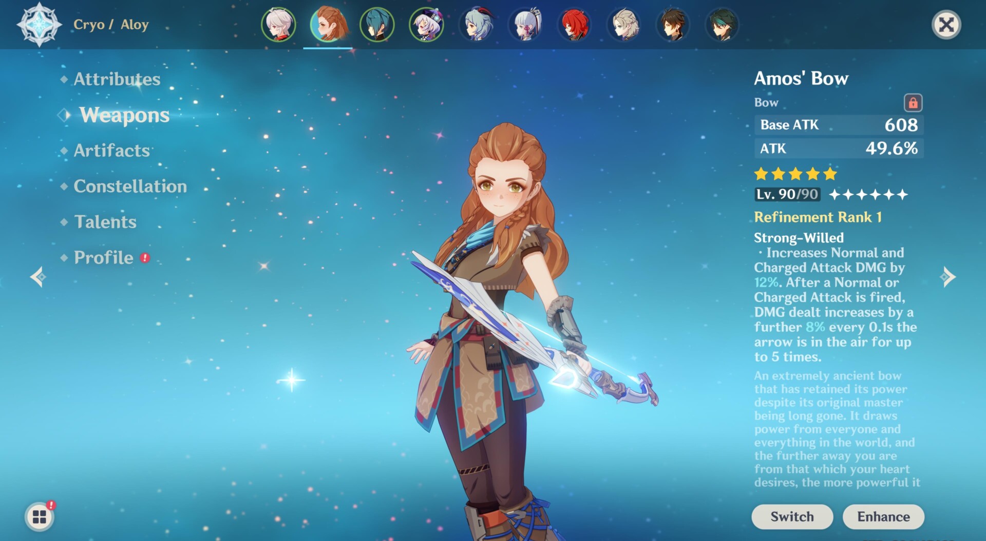 Thundering Pulse (crit damage) vs. Amos Bow (ATK%) vs. Skyward Harp (crit rate) – If we’re looking at the best weapon for Aloy in Genshin Impact, then we need to discuss these 5-star options: