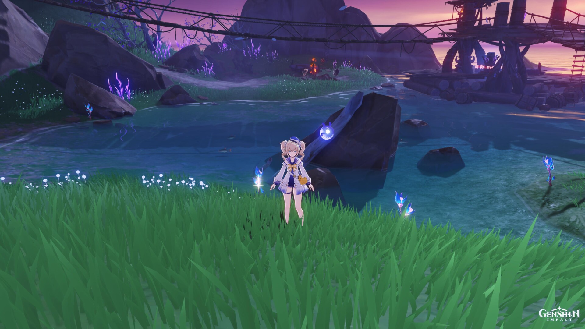 The Amakumo Fruit item in Genshin Impact has bluish petals and a reddish stem. The good thing about farming these is that each node gives you two materials. Even better, most of them tend to be clustered as well.