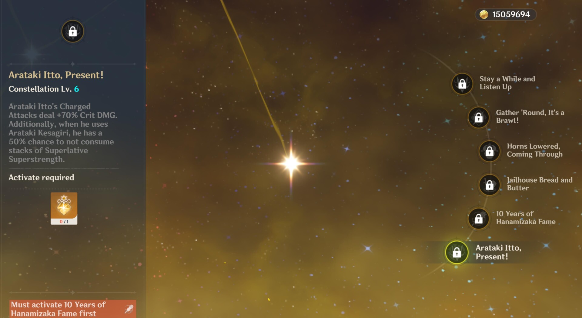 - C6: Arataki Itto, Present – Charged attacks deal +70% crit damage. Likewise, the Arataki Kesagiri slashes have a 50% chance to no longer consume Superlative Strength stacks.
