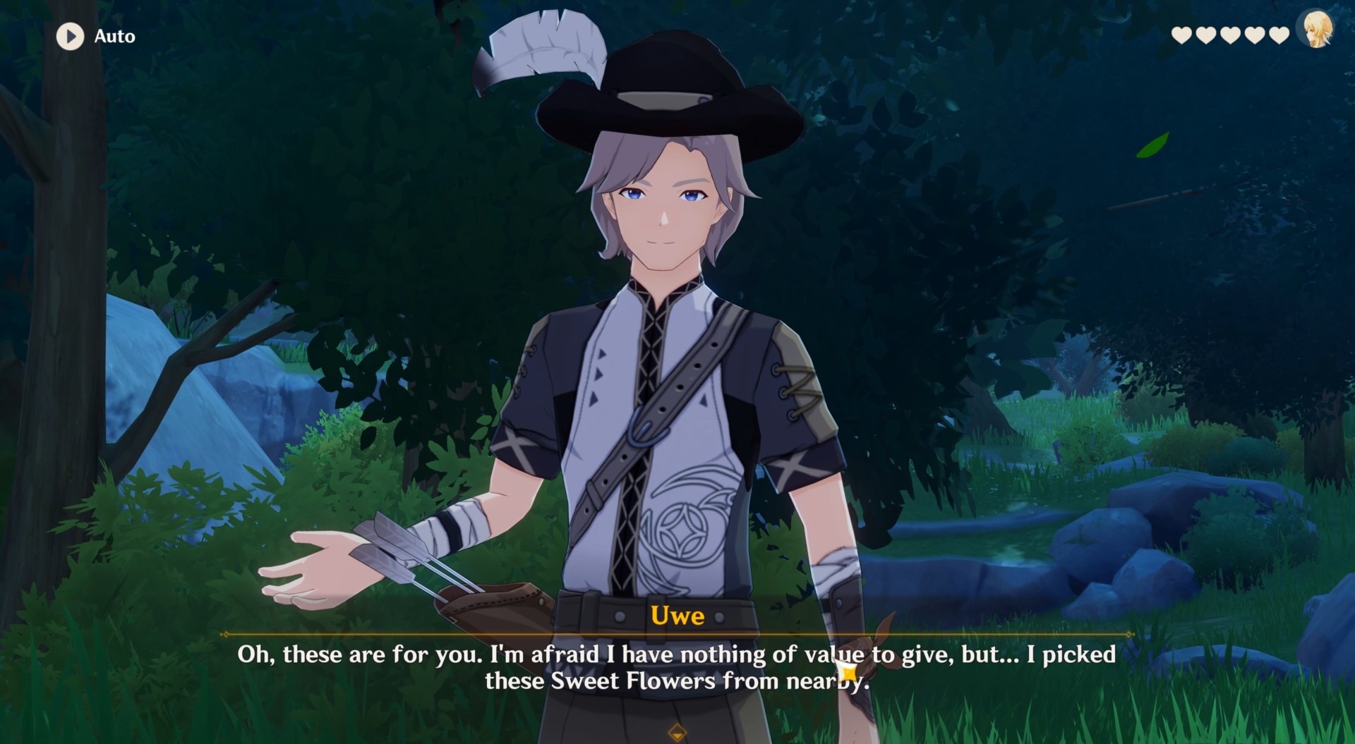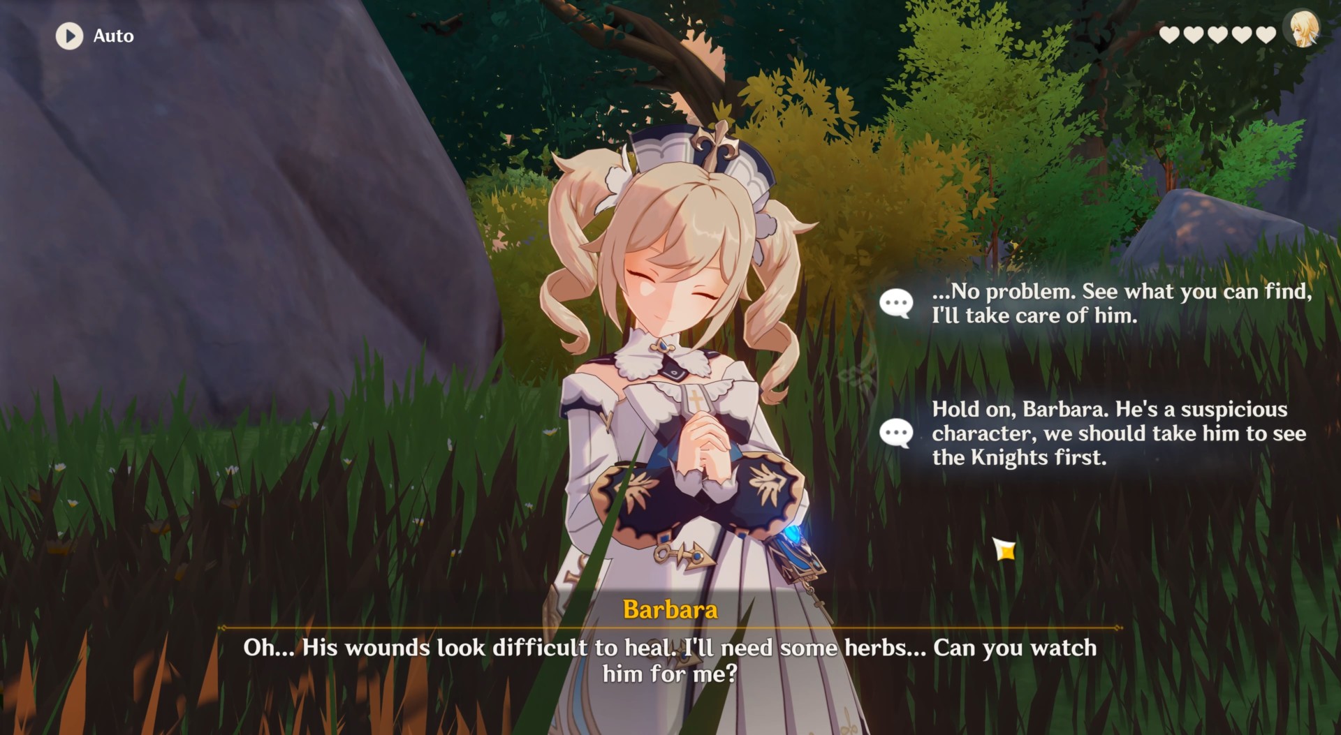 Alternatively, you can tell Barbara to stay put so you can look for ingredients. Go to the marked location and grab 3x Small Lamp Grass. Return to Barbara and she’ll heal the man. He admits to being a treasure hoarder, but he’s grateful for the help nonetheless. He’ll provide you with the sweet flowers necessary for Barbara’s mix.