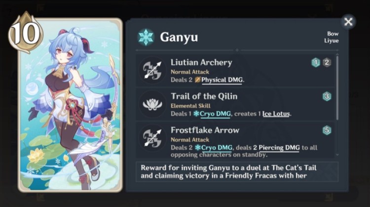 I do consider Ganyu has one of the best Character Cards in Genshin Impact’s Genius Invokation game. First, there’s her Trail of the Qilin (3x Cryo/Omni), with the Ice Lotus effect that’s akin to Mona’s Reflection (i.e., one point of damage reduction). Her Frostflake Arrow bloom shot, while costly (5x Cryo/Omni), does +2 Cryo damage and +2 Piercing damage to other characters on standby. And, to top it all off, there’s her Celestial Shower burst (3x Cryo and 2x Energy), which is very cost-effective. It deals +1 Cryo damage and +1 Piercing damage to standby units, while summoning a Sacred Cryo Pearl. This deals the same amount of damage at the end of your phase and it has two charges.
