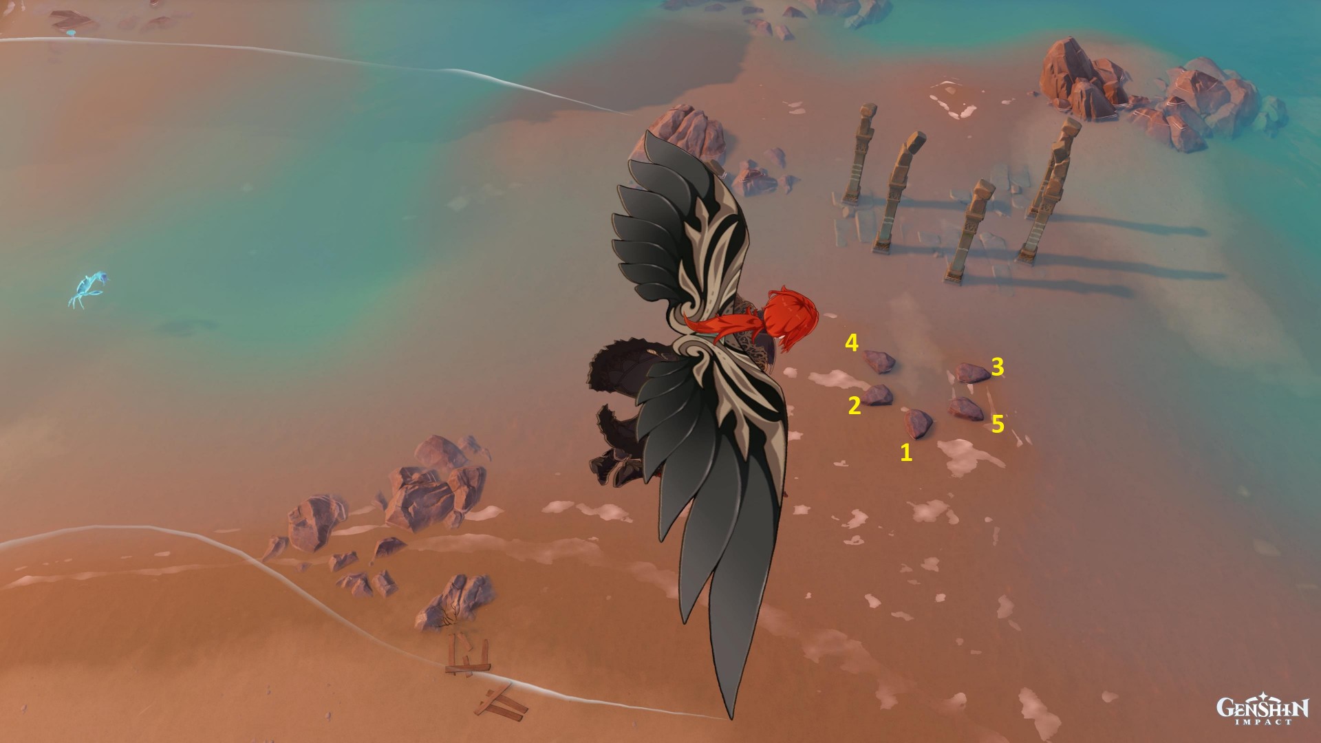 If you’ve done all of these, return to the beach where you spotted the water pillars. Take a look at the scratch marks. These denote the order that you’d step on the corresponding stones.