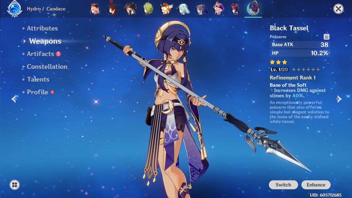 Black Tassel (R5) – The Black Tassel is a free-to-play 3-star Polearm weapon that’s viable as one of the only Polearms in the game to raise HP%. Candace’s Elemental Burst buffs your characters’ Normal Attack DMG, and this is increased further the more HP Candace has thanks to her 4th Ascension Passive. If you have enough HP% through her artifacts, then the Black Tassel is a great option for Candace.