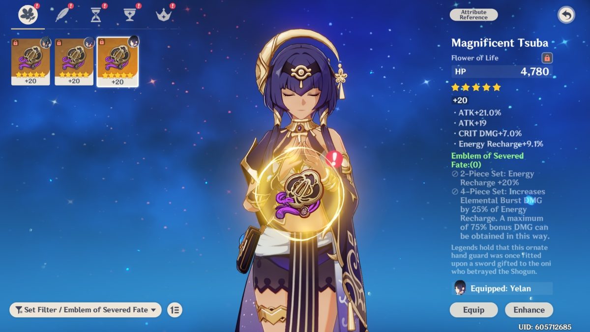 Candace’s Energy Recharge requirements are high, and her Elemental Skill does not provide a lot of energy particles. Therefore, it’s recommended that you use the Emblem of Severed Fate if you are struggling to get enough Energy Recharge to consistently use her Elemental Burst.