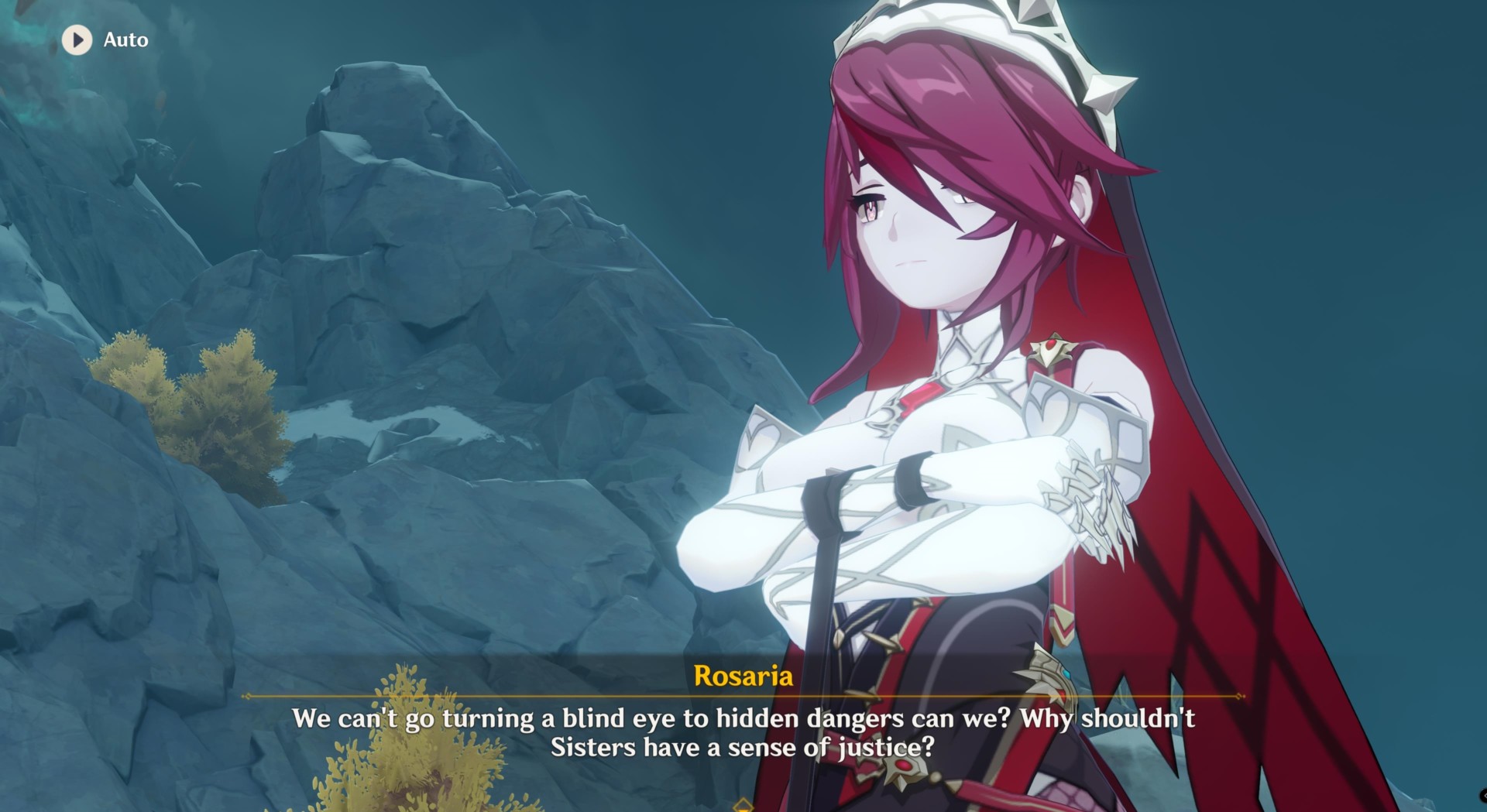 Anyway, by following the tracks (press the middle mouse button to activate your elemental sight), you’ll encounter Rosaria, a nun from the Church of Favonius.