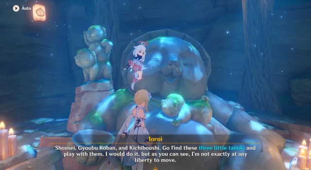 Continue following it until you reach a clearing with several hilichurls. Take them all out so you can speak to the mischievous tanuki statue named Ioroi.