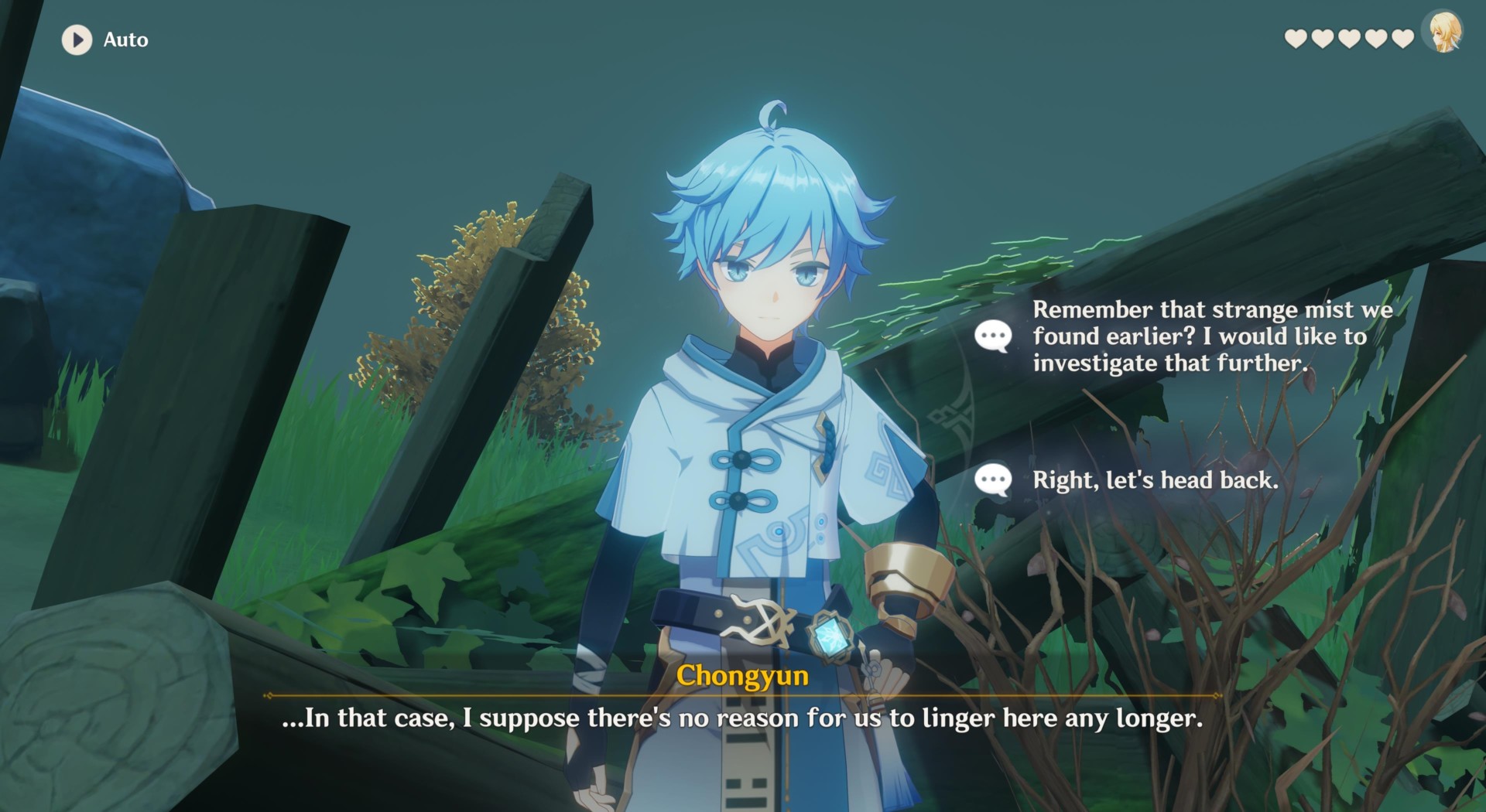 If you decide to just head back, this will conclude your investigation. The Traveler and Chongyun will part ways.