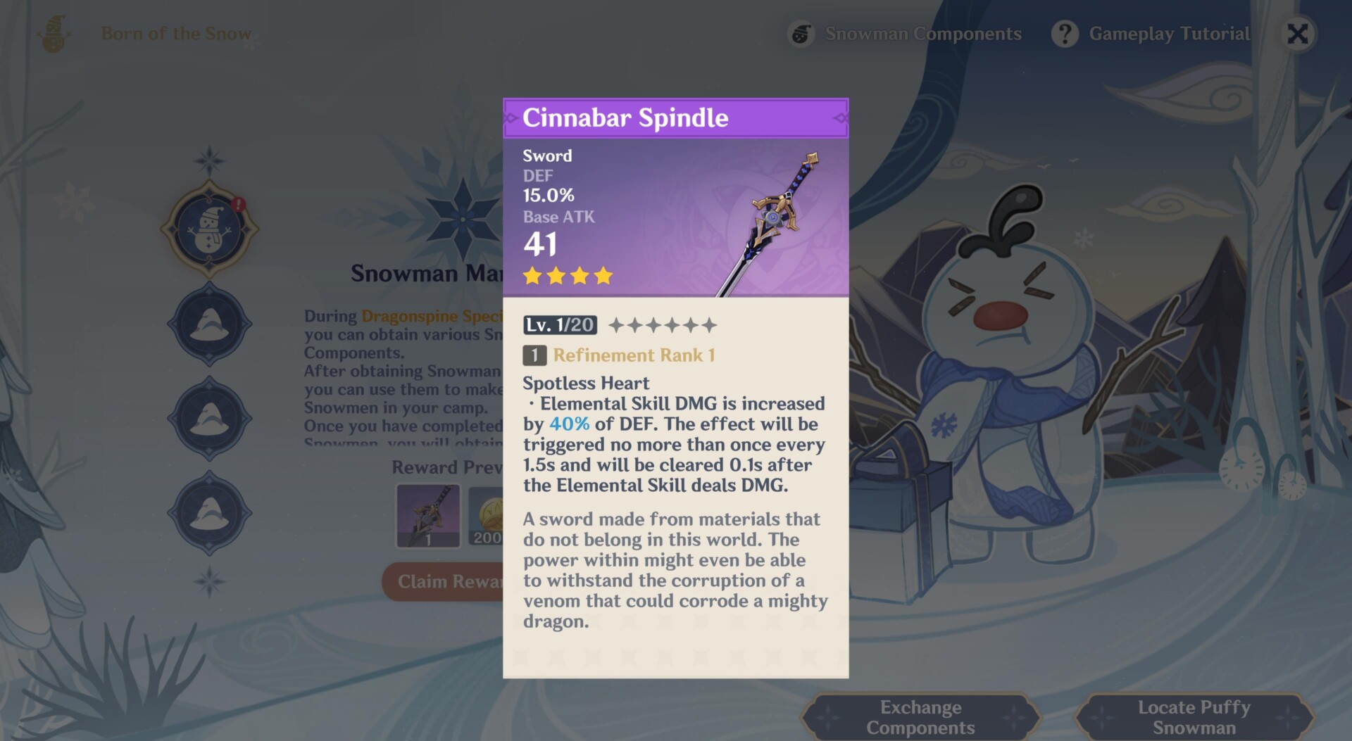 To build a Puffy Snowman, you’ll need to collect Snowman Heads from the Dragonspine Combat Training and Dragonspine Tracker Training activities. Likewise, the ice blocks that you’ll find while doing the latter contains some components and accessories, too. Once you’re able to fully construct a Puffy Snowman, you’ll get the Cinnabar Spindle sword in Genshin Impact.