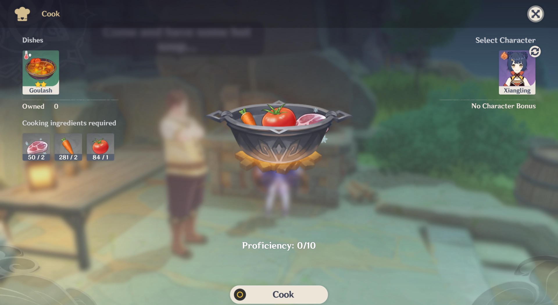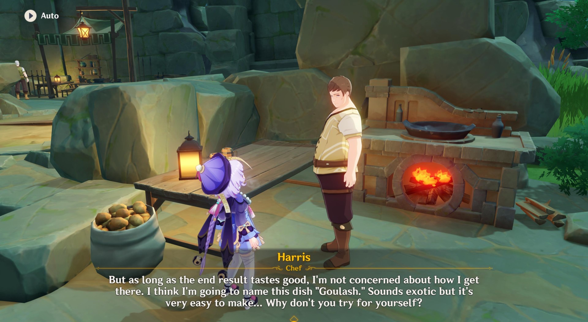 Learn the Goulash recipe and make the dish (2x Chilled Boar Meat, 2x carrots, 1x tomato). Then, wait until 1800 to speak with Harris again. This will finish the sidequest netting you 4x Hero’s Wit, 40x primogems, 5x Delicious Goulash, and 6x Mystic Enhancement Ores.