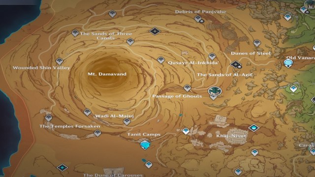 There are multiple paths that will help you reach the Desert of Hadramaveth in Genshin Impact. However, the most viable is the area/fast travel point north of the Dune of Carouses. Once you spawn there, you should see a Statue of the Seven in the distance. Upon tagging that, the whole desert region will be revealed, including other teleporters and domains.