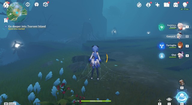 Nope, we’re not kidding. Remember those perches that you made offerings at during Day 1? Well, you’re going to destroy them as part of Day 3 of the Through the Mists quest in Genshin Impact. To start it, go to Ritou and talk to Kama. Then, travel back to Tsurumi Island. Pass through the giant archway once more to slightly clear the fog on the world map.