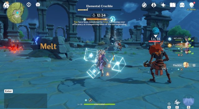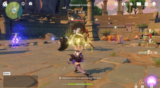The objective of Genshin Impact‘s Elemental Crucible event is to defeat mobs (especially the larger ones) who’ll drop Elemental Clots (colored cubes). These come in different colors corresponding to the various elements in the game.
