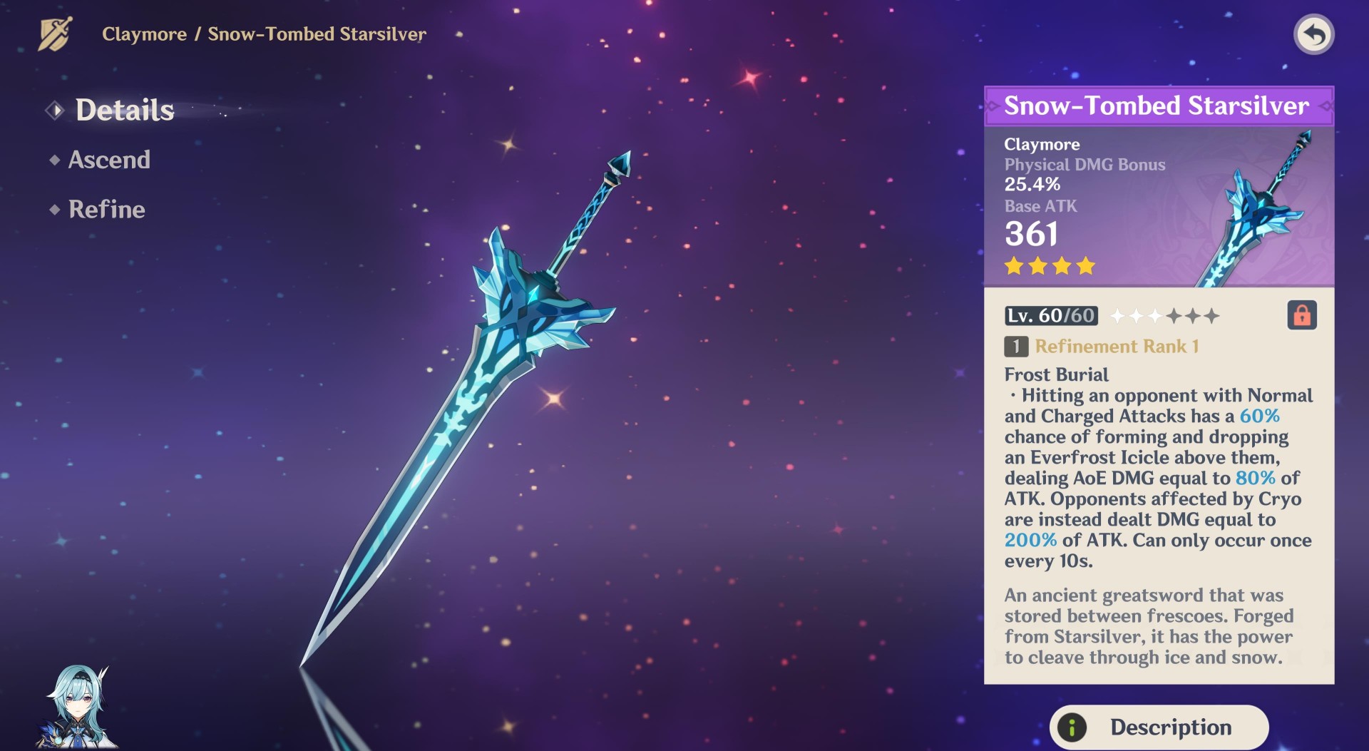Snow-Tombed Starsilver (Physical damage) – If you don’t plan on wasting primogems or cash on the Song of Broken Pines, then the Snow-Tombed Starsilver (seen below) can be used as a free-to-play substitute. You can obtain it by finding the stone tablets in Dragonspine. The weapon has a chance of dropping icicles on enemies if you hit them with normal or charged attacks. The damage is greatly increased if enemies are affected by the Cryo element (which is a given if Eula is active).