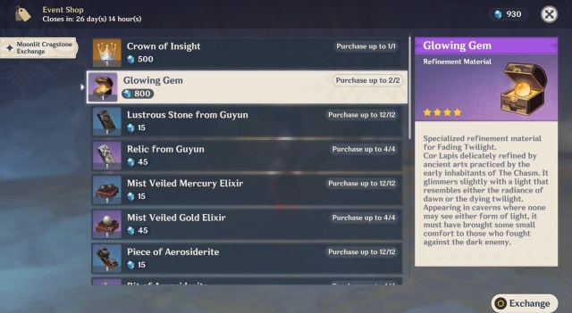 Last but not least, the Fading Twilight in Genshin Impact also has a refinement material called the Glowing Gem. By completing Realms of Guile and War challenges, you’ll earn the Moonlit Cragstone currency. This can be spent in the event shop for the Glowing Gem material. At the moment, you can only buy two, though we might see additional ways to earn more in the coming days.