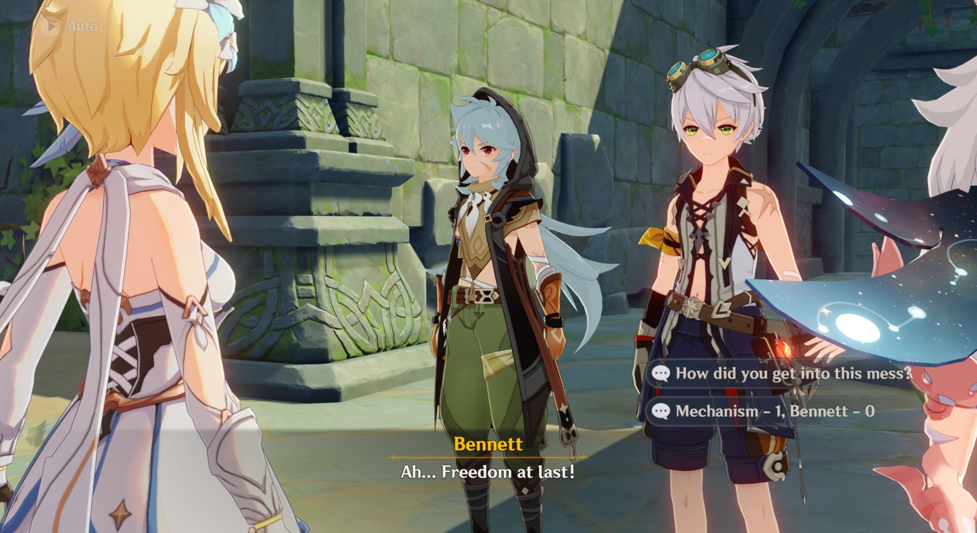 Now, the gang’s supposed to talk to Bennett, but he seems to be missing. Speak to Barbara and Rosaria in the cathedral, and you’ll then be led to the Thousand Winds Temple. After taking out the Ruin Hunter, check out the nearby cage to find both Bennett and Razor. You can interact with the nearby wall panel to release them both.