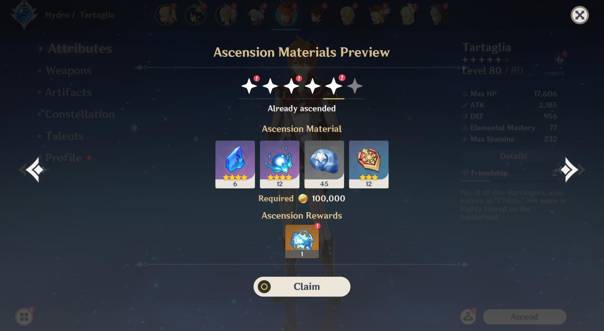 - Hit Ascension 5 for the characters who’ll become very important throughout your Genshin Impact progress. Examples include S-tier and A-tier characters such as Diluc, Tartaglia/Childe, Venti, and others.