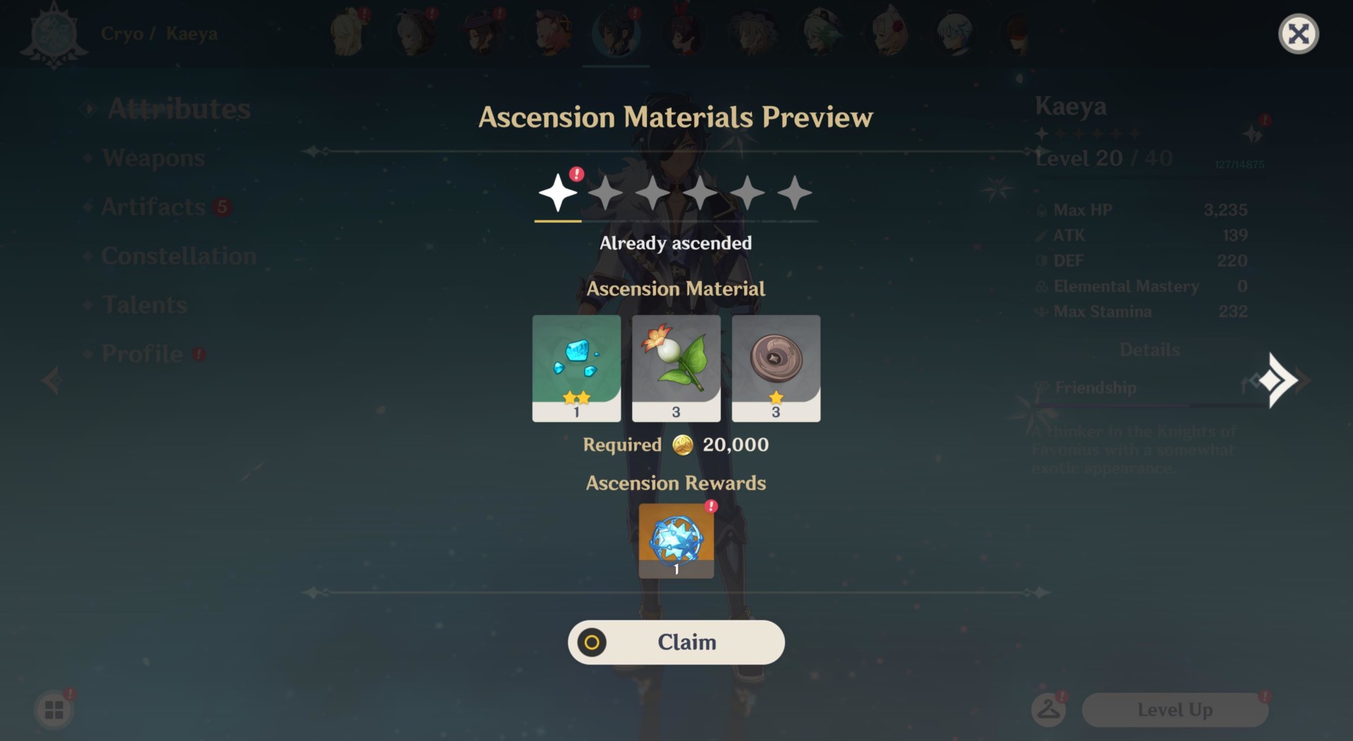 Now, you’ve probably noticed that you don’t have any mail that gives you Acquaint Fate. Don’t worry because you can find this in Genshin Impact‘s character menu. Go select any of your peeps and you should see a small button on the right-hand side of the screen. If you click on it, it shows you the character’s Ascension progress, Ascension materials, and the Acquaint Fates you can claim.