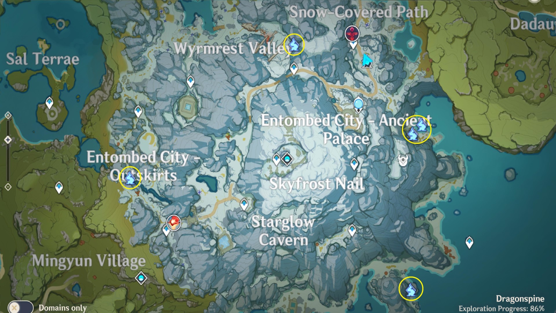 Note: There are 80 Crimson Agates found in the Dragonspine region. A majority are readily seen as you explore, though some are hidden. You can refer to our secret Crimson Agate locations guide for more info.