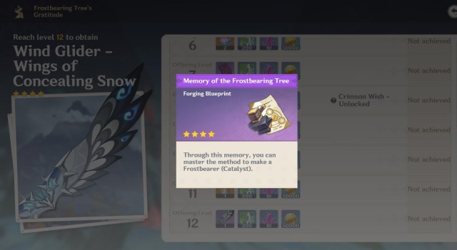 Bear in mind that the 80 Crimson Agates found in the wild can only boost the Frostbearing Tree up to level 9. To rank-up from level 10 to 12, you’ll need more of these.