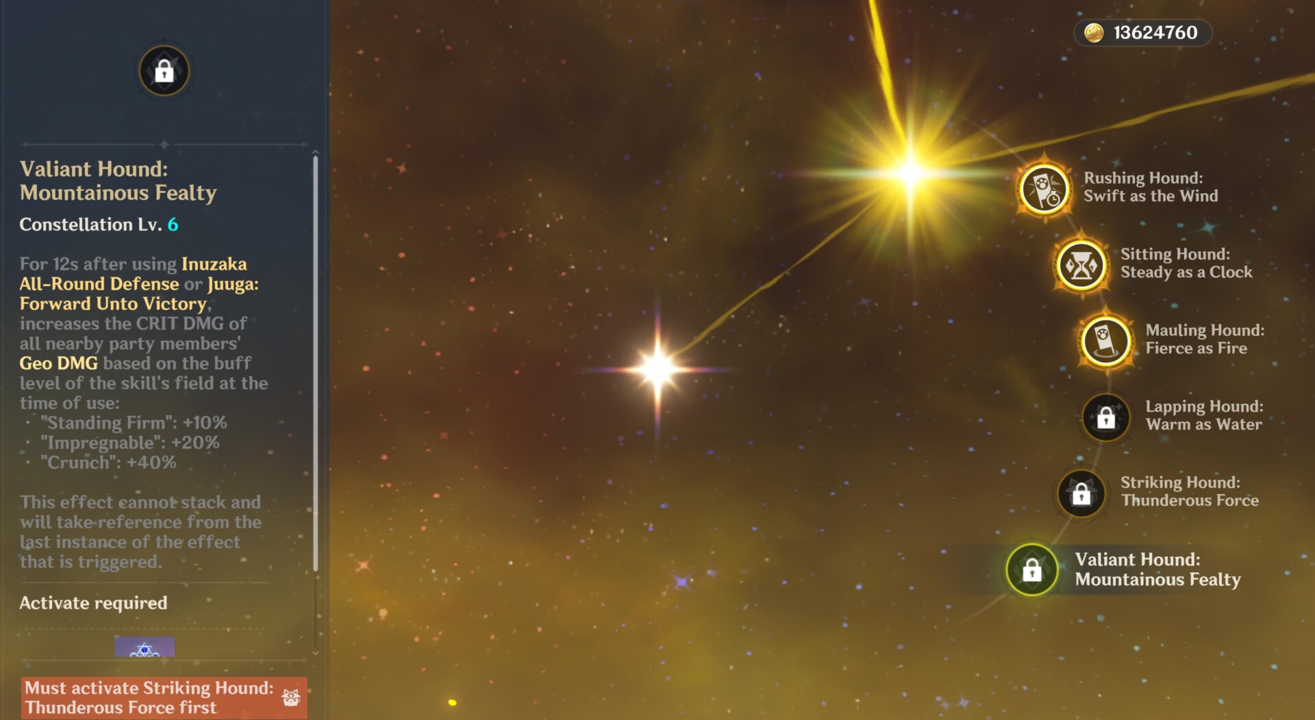 - C6: Valiant Hound: Mountainous Fealty – For 12 seconds after using your elemental skill or elemental burst, all party members’ Geo abilities will have their crit damage increased by: