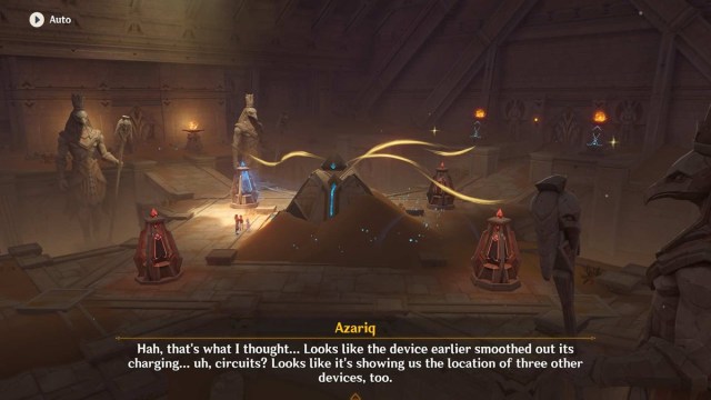 You’ll enter Gurabad’s Ruin in Genshin Impact after your initial tasks in the Dirge of Bilqis quest. Jeht’s pal, Azariq, will tell you about the devices in the temple. Basically, the objects called Ruin Mechanisms (i.e., large stone pylons) emit a blue glow which. Hitting them will cause the beam to rotate, removing piles of sand in an area. This lets you spot hidden stuff like switches and levers.