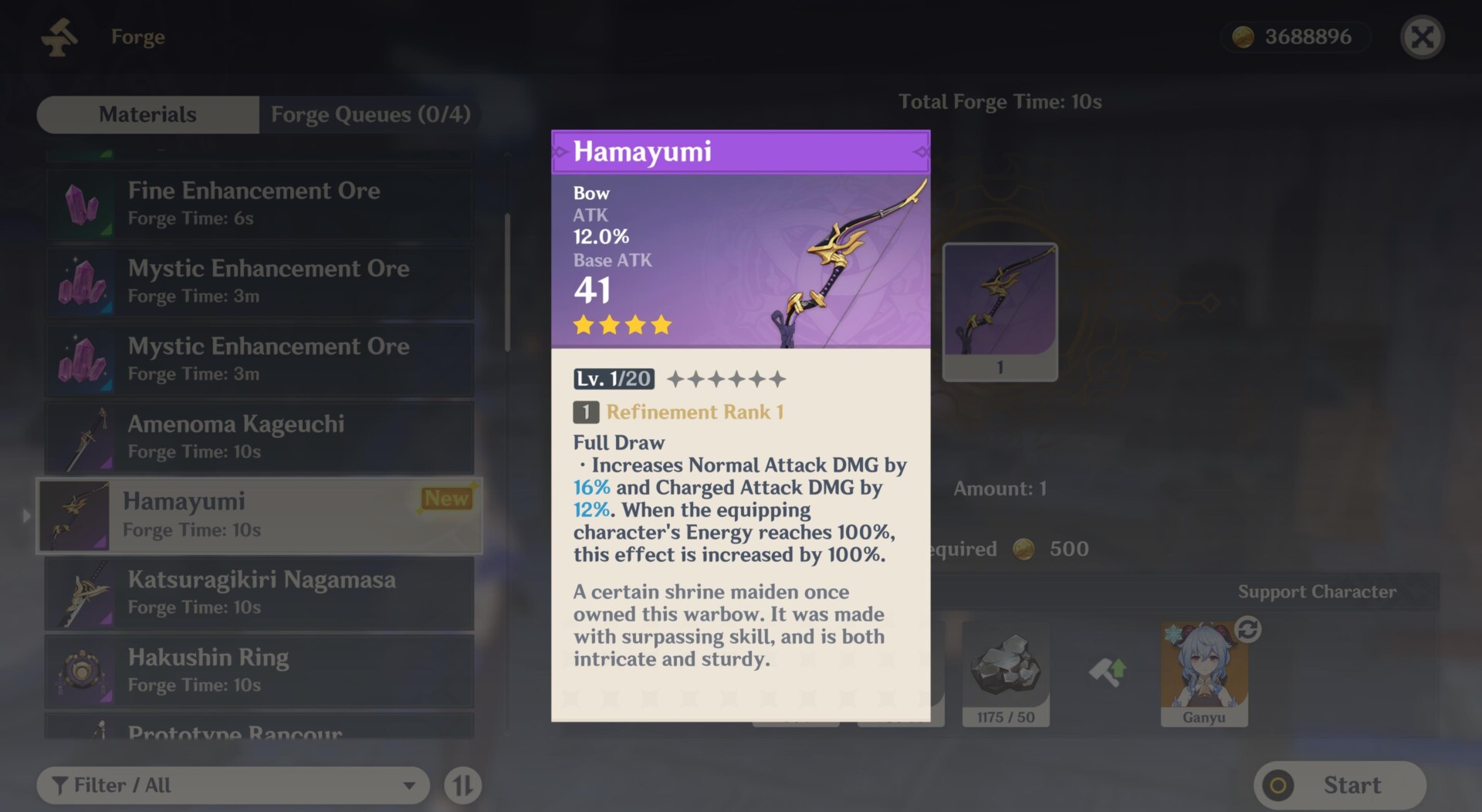 It has ATK% as a sub-stat and the “Full Draw” perk. The perk increases normal and charged attack damage by 16% and 12% respectively. When the character’s energy is at 100%, the buffs are also increased by 100% (i.e., 32% and 24% respectively). At a glance, the weapon looks like a decent fit for Ganyu (owing to the charged attack bonus). It might also be viable for Yoimiya, though she’s not yet available via wishes.