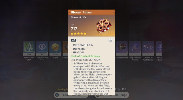 - Four-piece bonus – Gain Curiosity buff stacks. You get one stack when you hit an enemy with a Geo attack. If you’re off the field, you receive one stack every three seconds. Curiosity can stack up to four times, with each stack providing +6% DEF and +6% Geo damage bonus.