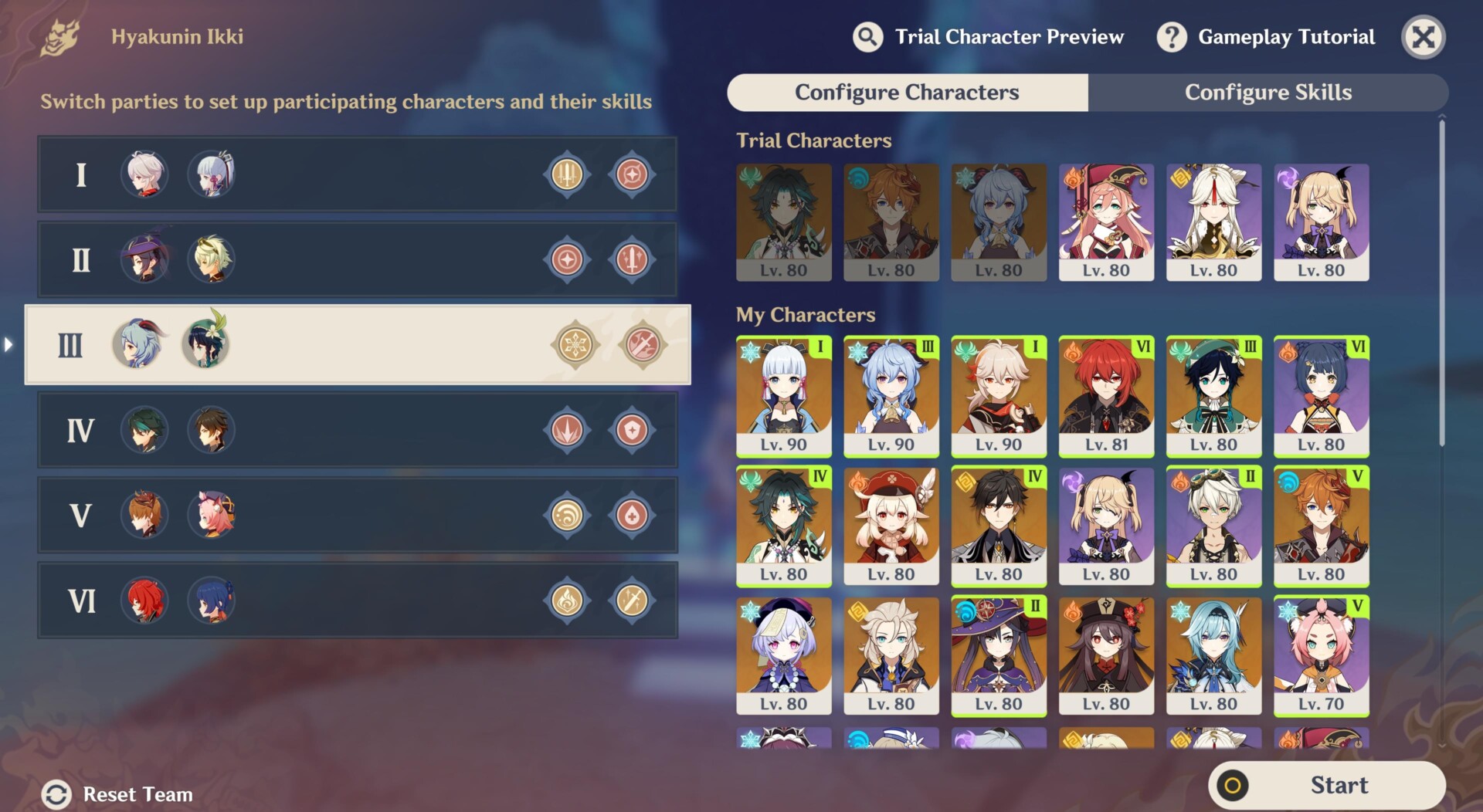 The Hyakunin Ikki event in Genshin Impact is unique in that you have to form six teams with two characters each. You’ll alternate among these teams in order as the battle progresses.