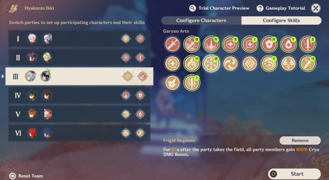Naturally, you’ll want to select Garyuu Arts skills that complement your duos, and you need to be mindful since you can’t apply the same one to a different group. For instance, if you have someone like Ganyu, then you’ll want Frigid Regimen, as well as either Lightcleaver Blade or Clean Cut True Sight. Of course, characters like Ayaka and Aloy would want that Cryo damage bonus, too.